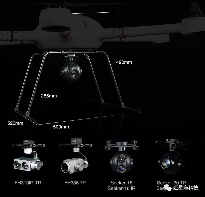 盖亚120具有宽大载荷空间,尺寸为520mmX285mmX500mm,可以搭载所有Foxtech系列变焦相机,如FoxtechSeeker-30TIR,FH336-TR,FH310IR-TR变焦相机,以及市场主流相机及其它各种载荷设备。