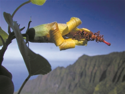 长久以来,美国国家热带植物园所在地——夏威夷考艾岛上的悬崖峭壁都被认为是人迹罕至的。而偏偏一些植物,就长在悬崖峭壁上。研究人员要想了解这些植物,就必须冒着生命危险去攀岩。现在,研究人员有了新帮手——无人机。今年1月底,一架无人机拍到了一种名为“Hibiscadelphus woodii”的花。这种花最后一次被看到是在2009年。2016年,植物学家宣布它已经灭绝。直到最近,研究人员再次发现它。