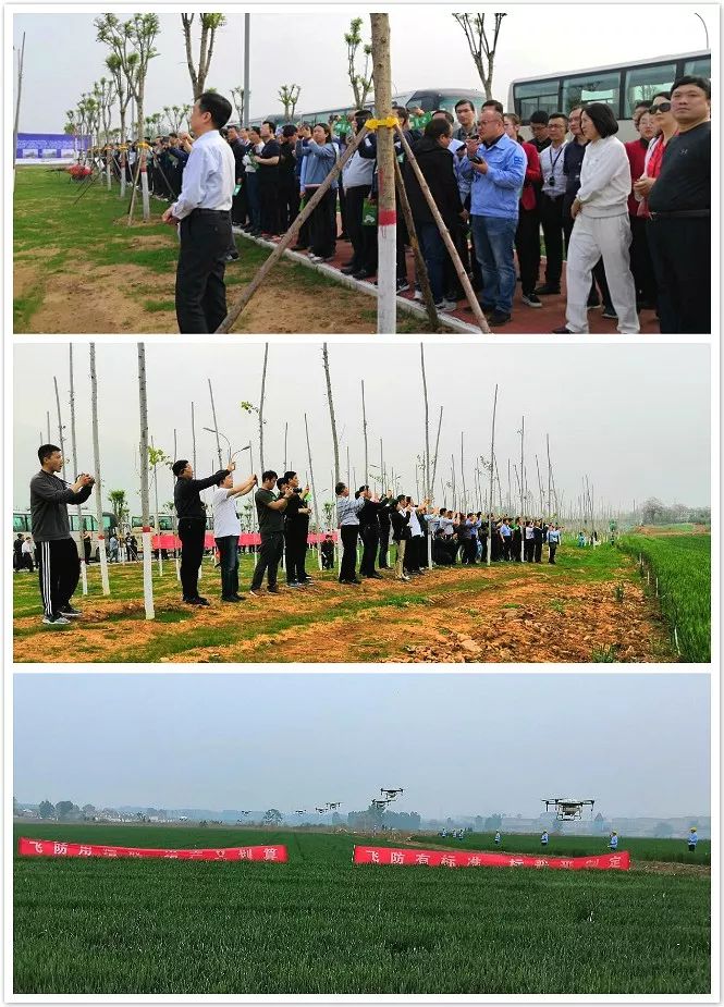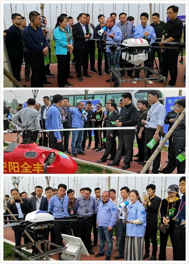 随后,领导们观看了植保无人机飞防作业的演示,数十架植保无人机演示了空中悬停、自主飞行、断点续航等。全丰航空吴小强经理向大家介绍到,经过第三方权威机构对安阳市2017年120万亩和2018年200万亩统防统治防效调查的数据显示:航空植保统防统治较农民自己防治,对小麦重大病虫害防治效果平均提高10%左右,用药量减少30%左右、用水节省90%以上。