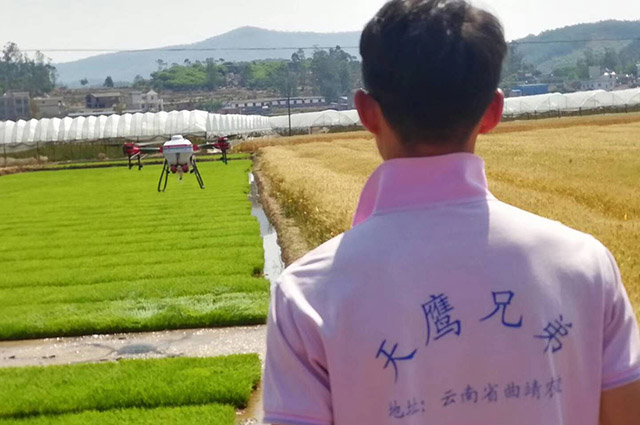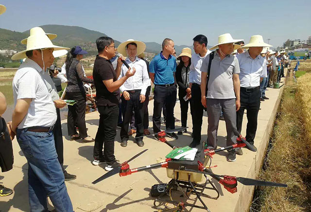 在禄丰县化肥农药减量增效示范项目田,云南天鹰兄弟技术员操控着三台植保无人机进行药肥喷施作业演示,展示了无人植保机节药节肥、减量增效的植保新技术,赢得与会人员高度赞扬。