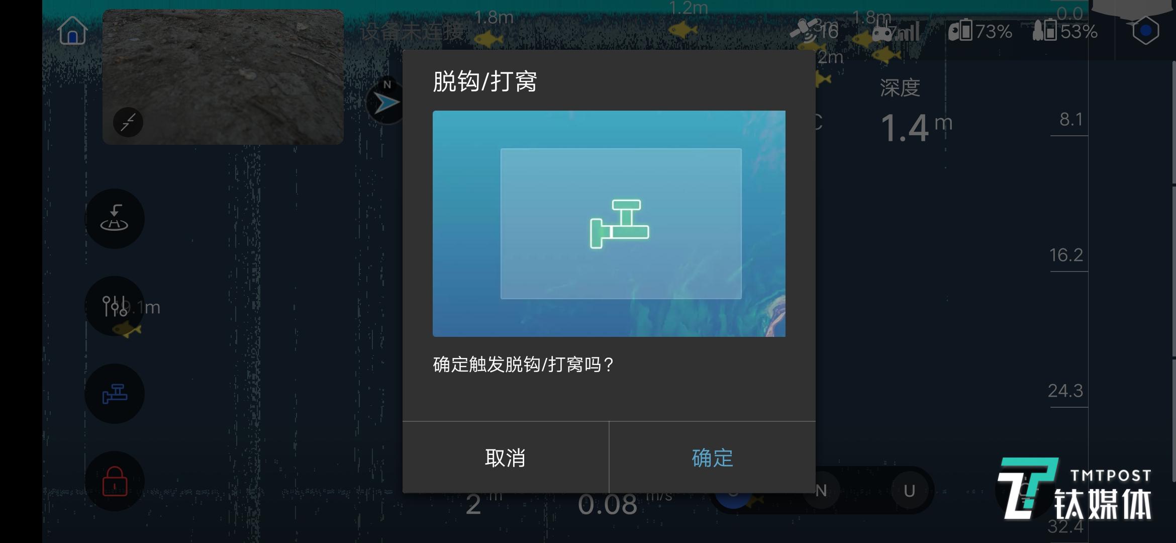 在遥控PowerDolphin小海豚时,APP操控界面有一个脱钩/打窝功能开关。操作者将无人机移动到相应位置后,可以对其进行解锁。