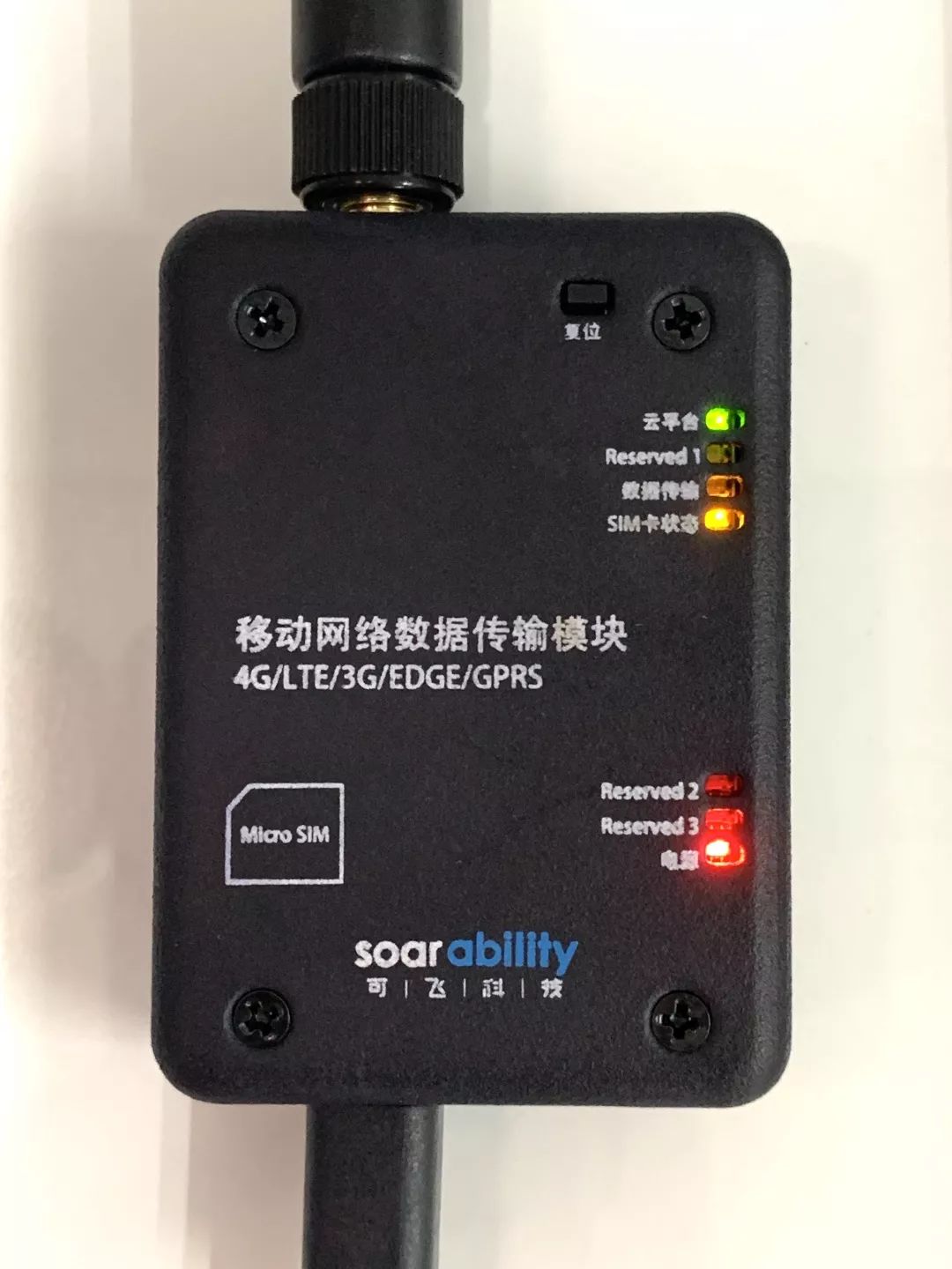 不管是数据输出端还是接收端,都具备电源、数据传输、云平台、SIM卡状态指示灯,便于用户了解当前工作状态。