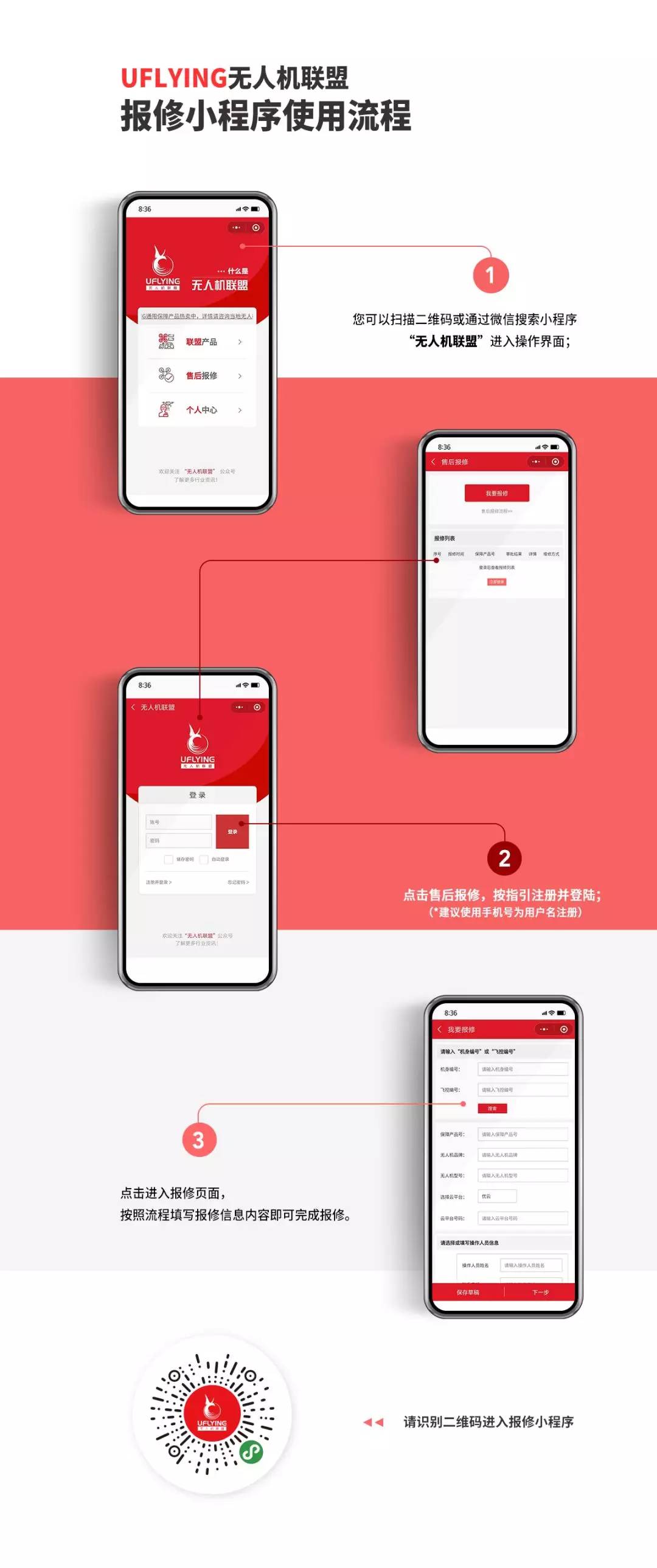 UFLYING无人机联盟的“无人机4S店”服务网络,能够为广大的植保飞手与无人机厂家提供售后服务,包括无人机机身与三者的保障产品,出现事故后通过联盟自主开发小程序,无人机报修应用平台,一键报修,推送联盟附近服务站,实现快速维修服务,提高作业季维修的时效性,有效解决植保飞手“维修难”的问题。