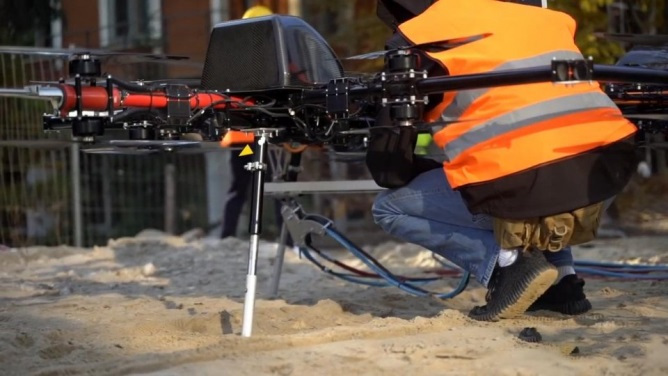 也就是说,无人机在飞行的时候下面拖着一跟电缆,除此之外,电缆旁边还有一根水管,无人机清洗玻璃用的水就是通过这根水管传上来的,而且水管里面装的是已经配好清洁剂的专用清洁水。