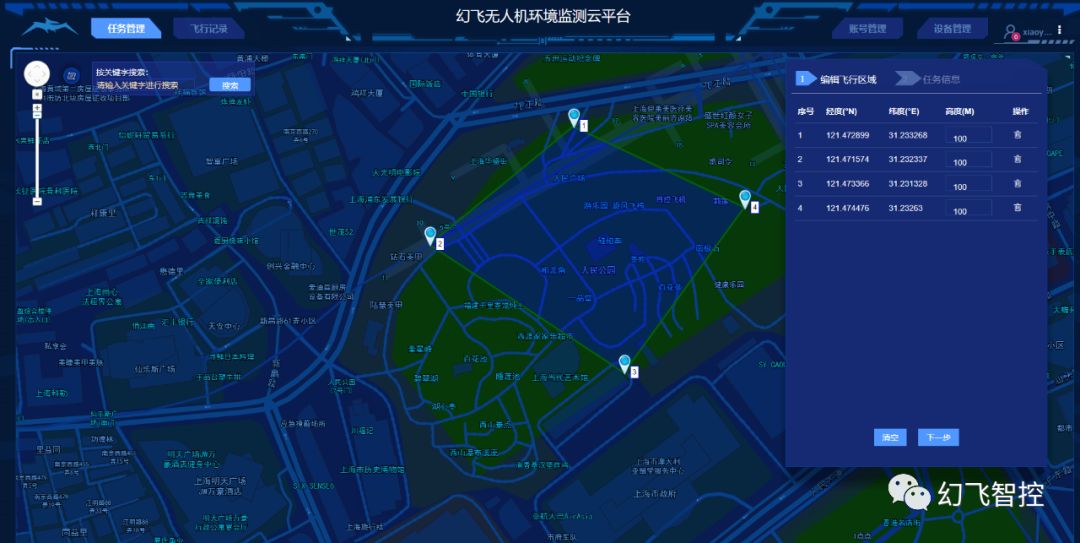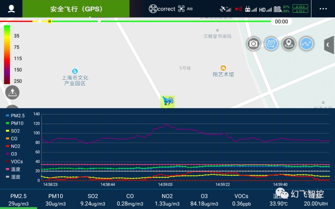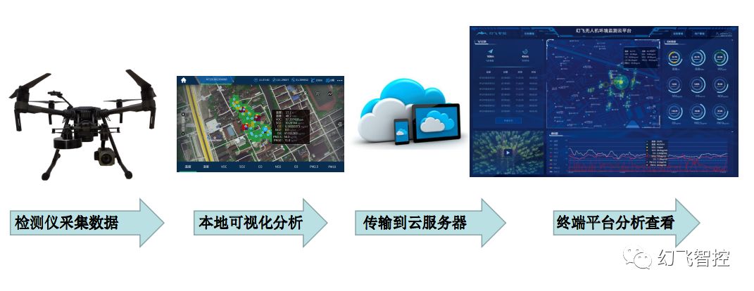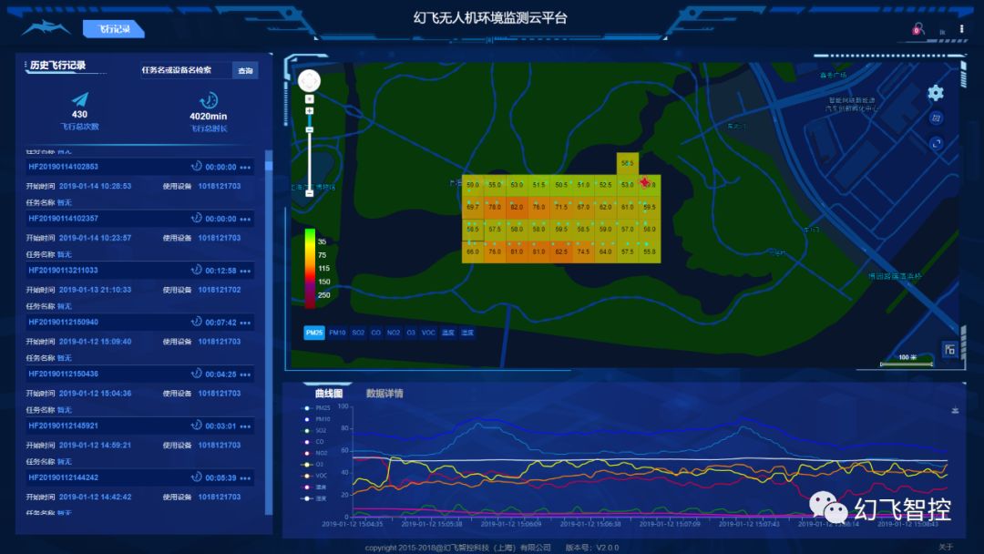 幻飞无人机环境监测云平台提供了可视化大数据展示,实时监测传输,海量数据存储分析对比,智能生成空气质量的分析报告,通过云计算与大数据技术的结合,实现了对污染物的来源、构成、衍化过程的精确分析。