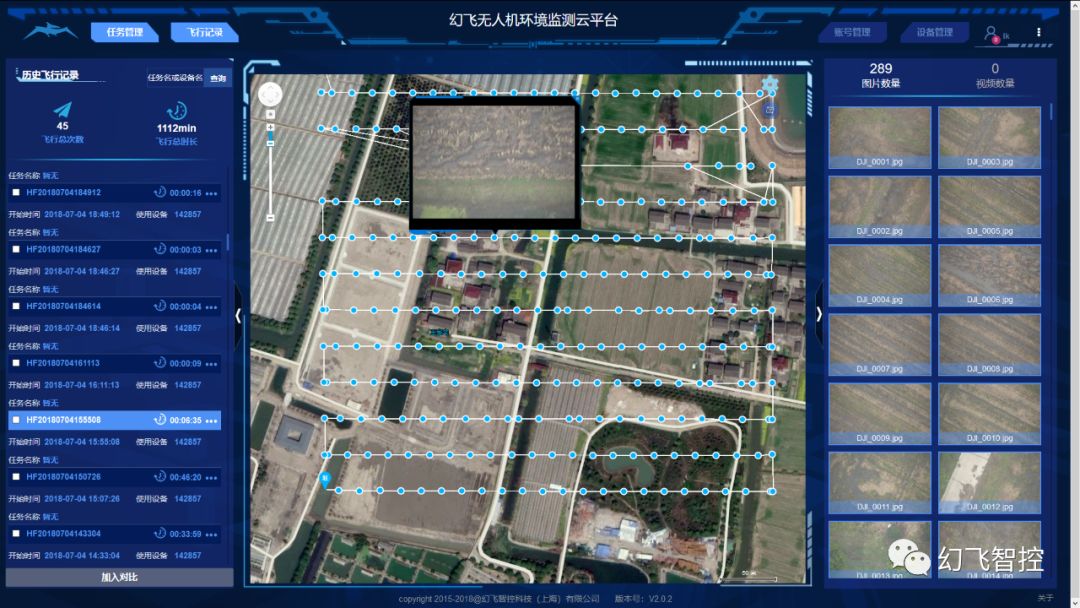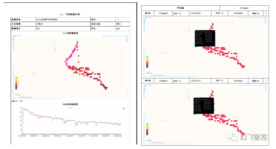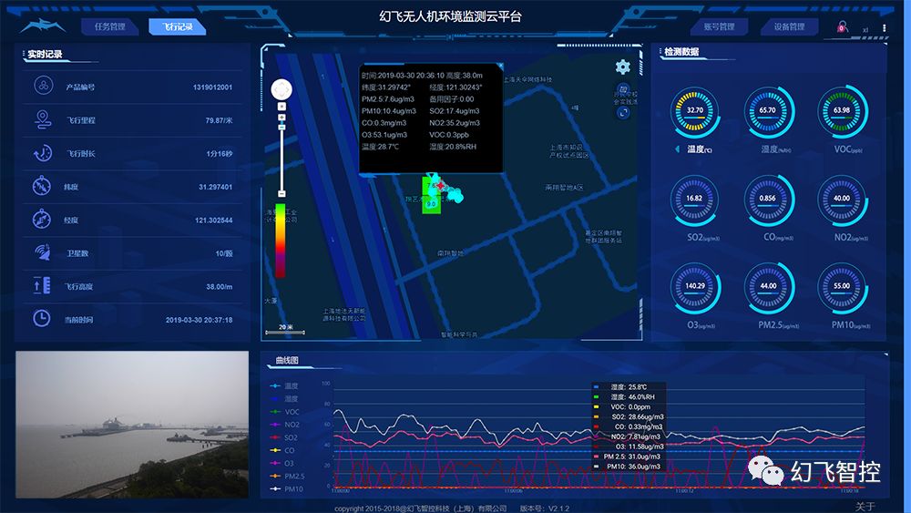幻飞环境监测云平台提供实时监测显示,实时显示飞行任务气体监测数值。并以栅格图曲线图等多形式表现。并同时回传实时视频。形成远程指挥,实时监测,控制任务执行。通过2D和卫星地图展示历史飞行轨迹,监测数据的栅格图、曲线图和视频信息等可视化方式展示。