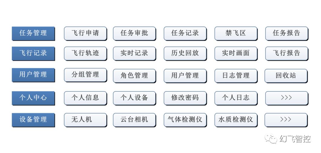 除了PSDK负载开发,幻飞团队基于“大数据”和“人工智能”技术将无人机信息与管理系统无缝整合,打造无人机环境监察云平台。这套系统由四个端组成,分别是无人机、地面终端、无线网络及指挥中心。