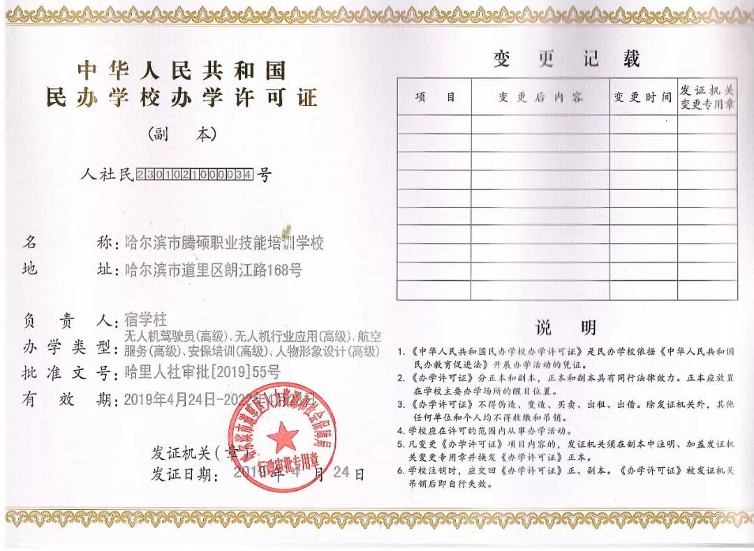 哈尔滨市腾硕职业技能培训学校是滕硕通用航空有限公司旗下一家专业从事无人机应用型人才培训的学校,滕硕通用航空有限公司注册资本5000万元,是国内前沿科技宏观型企业,是集设计、研发、生产、销售、售后、维修、服务、人才培养为一体的行业领先的无人机科技型企业。产品种类涉及民用、军用多旋翼无人机、直升无人机、固定翼无人机,倾转旋翼无人机,及其他类型的航空器,其产品广泛应用于农业、公安、消防、反恐、国土、规划、军事、灾害应急、物流配送、智慧城市等诸多领域。