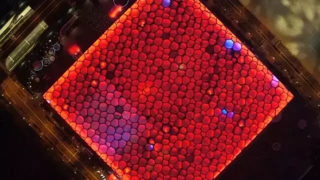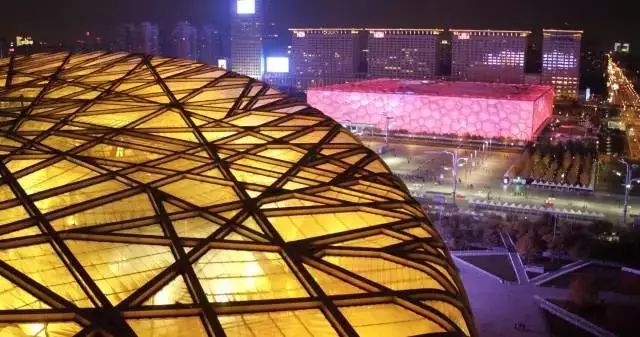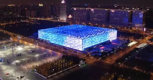 航拍鸟巢及水立方,色彩变换的水立方,绚丽无比。摄影:大疆传媒