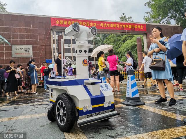 广州,华师附中考点,搭载智能AI摄像头和移动警务功能的机器人,在考场周边巡逻防控,及时发现不法分子并通知周边警力。