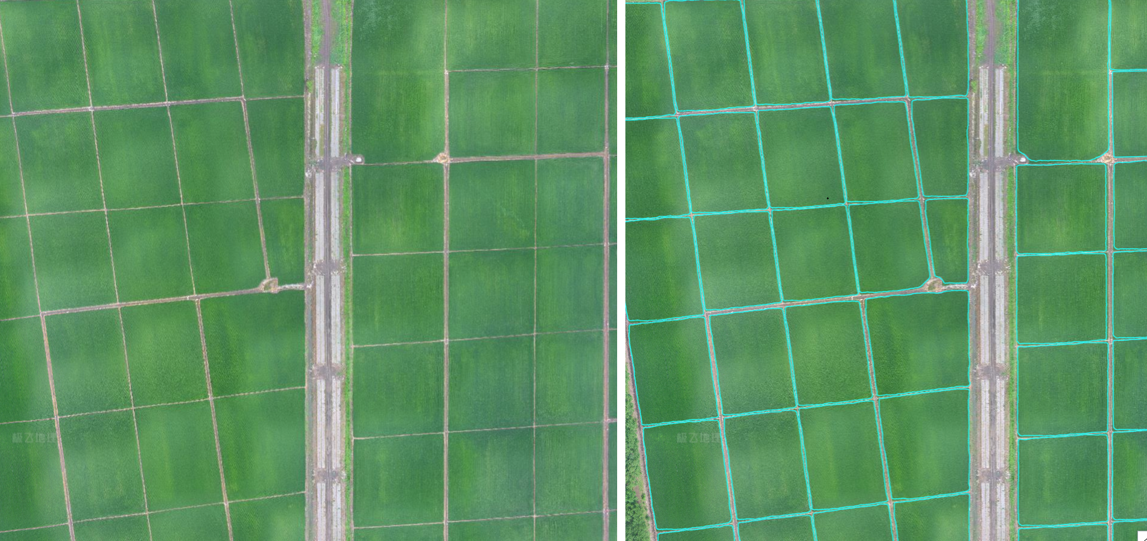 XAI 基于无人机高清图像自动识别农田边界(右)。该高清农田地图可导入植保无人机,指导无人机精准飞行并完成全自主作业。