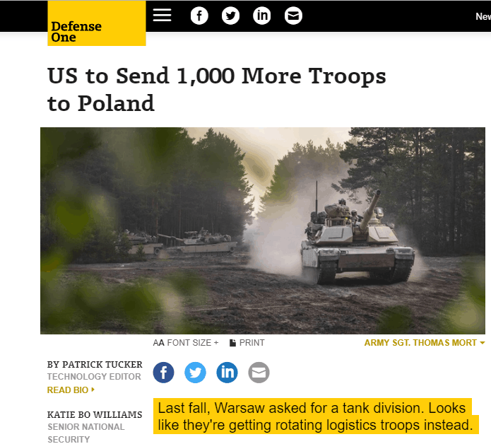 美国军事网站“防务1号”援引一名国防官员的话称,美国总统特朗普定于12日会晤波兰总统杜达,届时可能宣布向波兰增派美军士兵大约1000人。