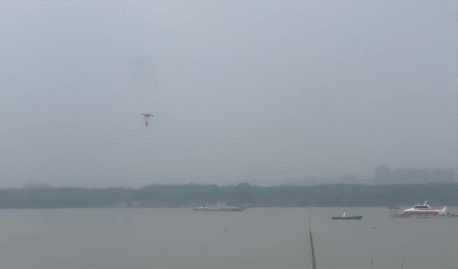 现场,消防救援无人机携带救生设备紧急升空,飞到遇险人员上空进行抛投救援。同时,水域救援机器人靠近近岸落水人员,实施营救。