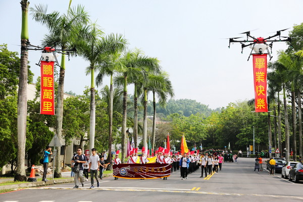 嘉義大學107學年度畢業典禮15日在蘭潭、民雄及新民三校區,以跨校區同步視訊方式舉行,校長艾群帶領師生進行校園巡禮,並由生物機電工程學系農用植保機團隊,以無人機拉起「鵬程萬里」、「畢業快樂」布幔,為畢業生送上祝福,成了此次畢業典禮矚目的焦點。