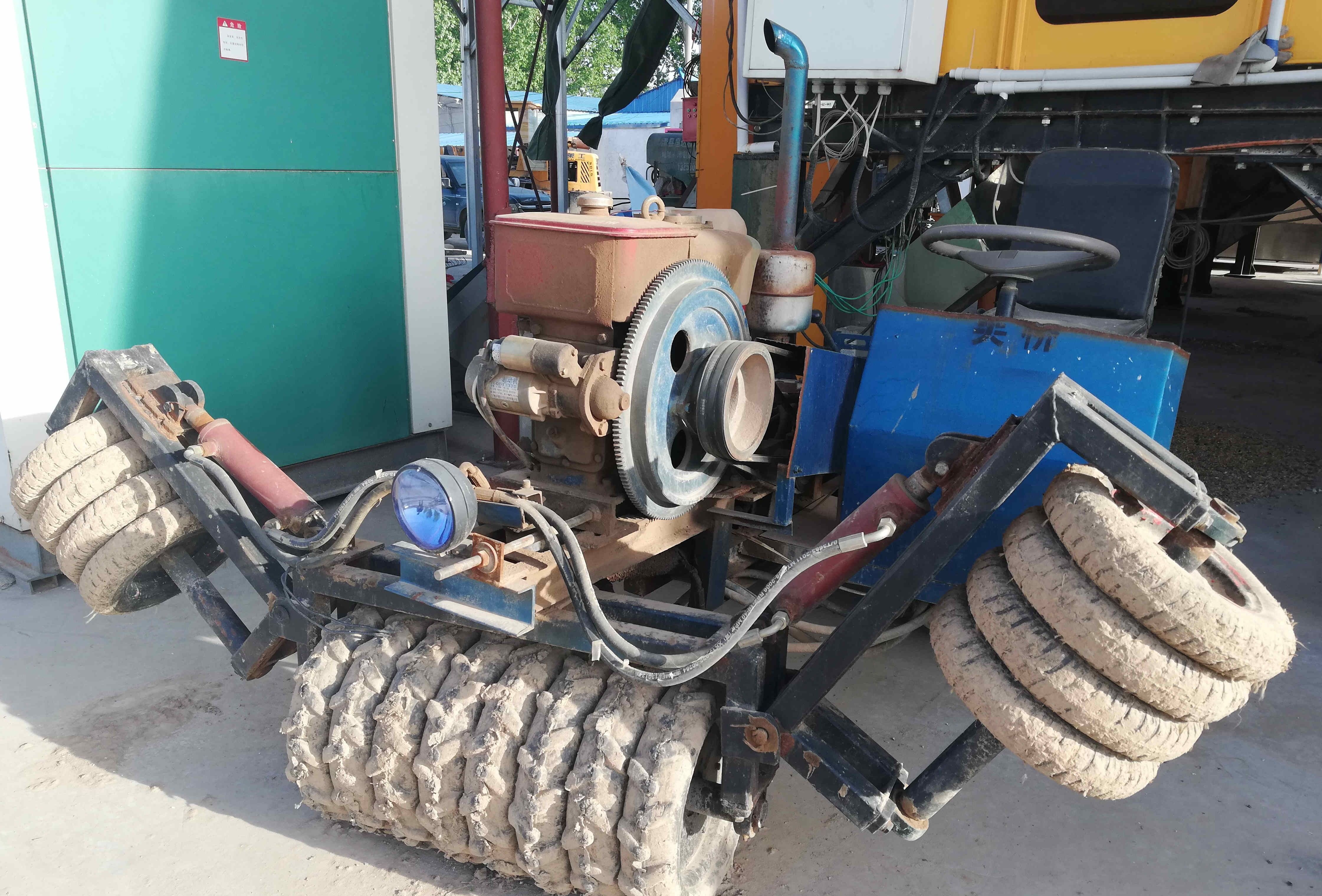 车架上安了一台柴油机,不算后面,仅前面就有十六个个轮子的作业机械,两边各四个轮子还能抬起来,还真不知道它到底是干啥用的?
