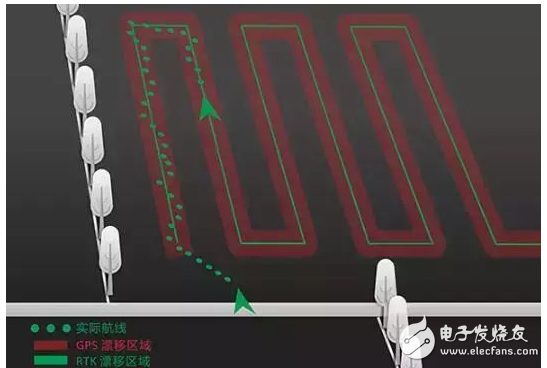 而使用RTK技术时,航线将是一个0-10厘米宽度的区域,与GPS相比,RTK基本等于是直线飞行,弯曲的幅度很小,因此效果将更均匀可控。