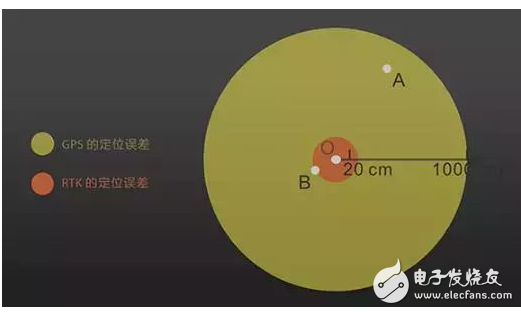 普通GPS的圆概率误差(CEP)有50%左右的概率在2.5米以内,另外50%的误差可能更大,甚至接近10米。上图中,当我们想要寻找O点的位置时,普通的GPS会告诉我们O点在A处,而A则是黄圈直径10米范围内的任意一个点。RTK通过实时差分技术,可以将范围缩小到10cm内。