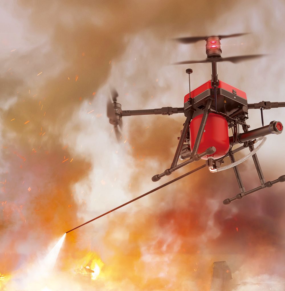 记者看到,一幢在建的大楼内,高层一处窗台出现“火情”,地面准备就绪的无人机迅速升空,它的底部连接着一根高强度柔性管道,管道另一端与地面的消防车水罐相连。技术人员操作无人机飞到着火点的高度。消防车内的水,通过管道,高压输送到无人机,再通过机载水枪水平喷射出去。