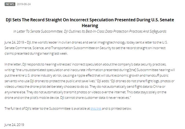 据环球时报从大疆方面获得的消息,6月18日,美国参议院的商业、科学及交通委员会还就“美国无人机产业的监管和发展问题”召开了一场听证会,且会上出现了一些有关大疆的不实传言,例如美方认为一个公司的安全可靠性仅仅与其“国籍”有关的荒谬言论。