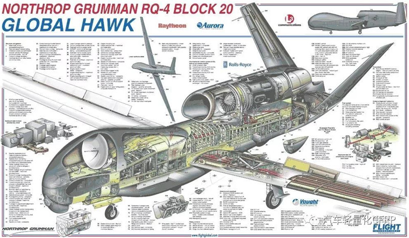 RQ-4“全球鹰”无人机是美国诺斯罗谱·格鲁曼公司研制的高空高速无人侦察机。大家一般认为无人机都很小,实际上它身体庞大(最大起飞重量接近12吨,其中燃油超过了7吨)、双翼为亚音速平直翼,翼展35.4米超过波音737飞机,球状机头将直径达1.2米的“合成孔径”雷达天线隐藏了起来。“全球鹰”飞行控制系统采用GPS全球定位系统和惯性导航系统,可自动完成从起飞到着陆的整个飞行过程(最大航时41小时,最大航程25945千米)。通过使用一个卫星链路,自动将无人机的飞行状态数据发送卫星,再由卫星传回到美国本土的任务控制单元。