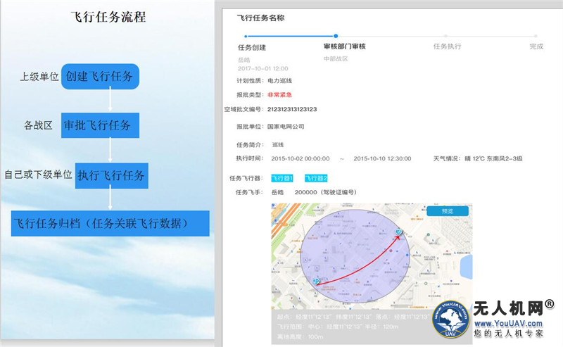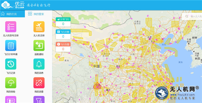 轻小民用无人机运行动态数据库系统,用于向无人机用户提供航行服务、气象服务等,对民用无人机运行数据(包括运营信息、位置、高度和速度等)进行实时监测。接入系统的无人机应即时上传飞行数据,无人机云系统对侵入电子围栏的无人机具有报警功能。