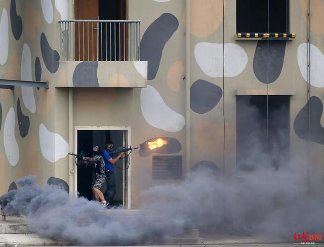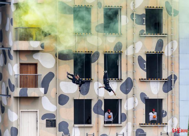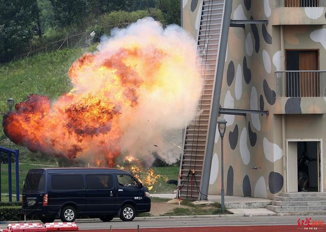 ↑演练现场,建筑物附近发生爆炸。特警“黑豹”突击队立即全副武装,火速赶赴现场