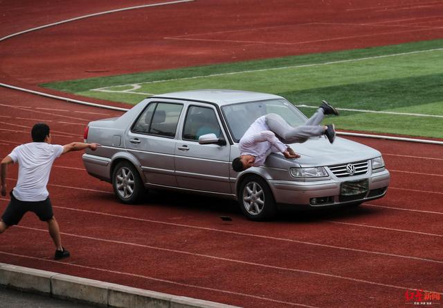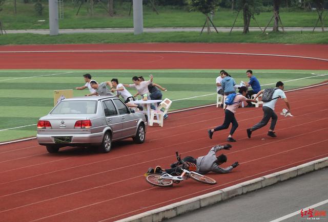 ↑演练现场,几名“犯罪分子”开车撞击路人