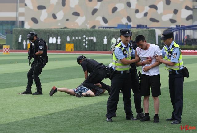 ↑演练现场,特警队员将“犯罪分子”制服