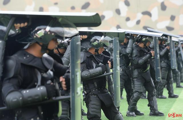 “杀!杀!杀……”6月30日在成都市公安局战训基地练兵场内,上千名特巡警全副武装,迅速集结成防暴阵型。特巡警先后展示了断裂队形、阻截队形、横队疏散队形、高姿防御队形、后方御敌队形、楔形驱散队形、内环形包围队形等7种不同类型的防暴战术队形,同时配套展示了单警盾牌、警棍、藤棍术,队员间配合娴熟、阵型变化迅捷有序。