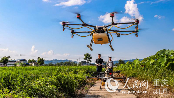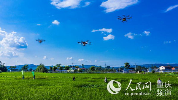 技术人员操控植保无人机在梁平区开展水稻病虫害防治作业