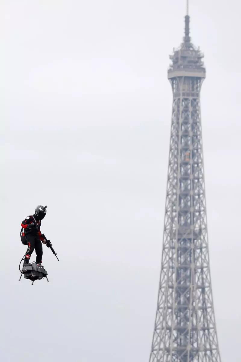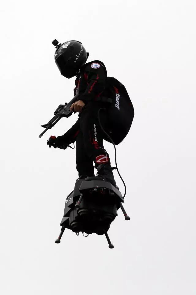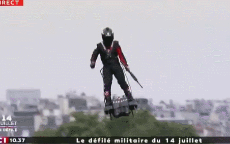 其发明者、法国喷气滑雪世界冠军弗兰基·扎帕塔(Franky Zapata)手持步枪,站在上面在阅兵式观礼台上空飞行了数十米。这一飞行器配有5个迷你涡轮喷气发动机,用以保证该踏板顺利起飞。据悉,该飞行器时速可达每小时190公里,飞行时间可达十几分钟,被认为是真正意义上的个人空中飞行器。据报道报道,法国国防部官员表示,这种由微型涡轮喷气发动机推动的飞行器将来可能被法国特种部队使用。