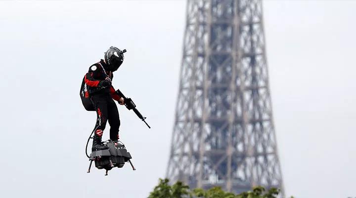 据新华网等媒体报道,当地时间7月14日,法国国庆阅兵式在巴黎举行,此次阅兵式上展示的前沿武器装备受到各方关注,其中一款单人操纵的喷气动力飞行滑板(Flyboard Air)扎更是将当天的表演推向高潮。