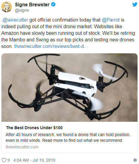 外媒报道称,法国无人机制造商 Parrot 正在退出迷你无人机市场。如果你是该公司 Bebop 或 Mambo 无人机的粉丝,还请赶在退市前支持一波。因为后续的话,Parrot 将把主要精力放到 Anafi 旗舰产品线上。周四的时候,科技网站 Wirecutter 在 Twitter 上证实了此事。