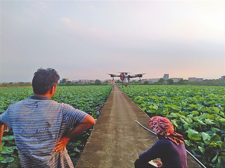 前段时间,藕塘的耕户卢先生一直苦于莲藕田间管理的问题:他承包种下的120亩的藕塘,如果用传统方式施药会破坏莲藕生长,粗放式施药既不科学也达不到效果。他打听到南沙区有农业服务公司能为难以人工施药的种植户提供植保无人机施药服务。
