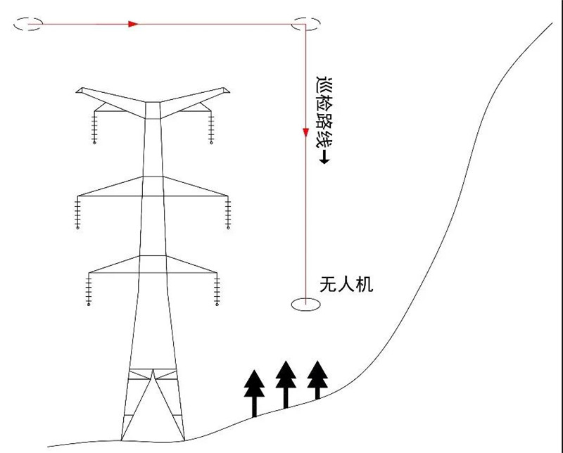 无人机飞越塔顶,在降高前可将无人机云台相机朝下 90°,以评估上山坡侧地形地貌,调整飞机位置,在与杆塔保持安全距离的情况下,适当远离上山坡侧山壁、树木。此外,飞手宜轻柔打杆,防止动作过大无人机因惯性撞击后方贴近的障碍物。同时,在较低的高度拍摄时,宜多次将云台相机竖直朝下确认无人机与正下方地表、树木的距离是否安全。