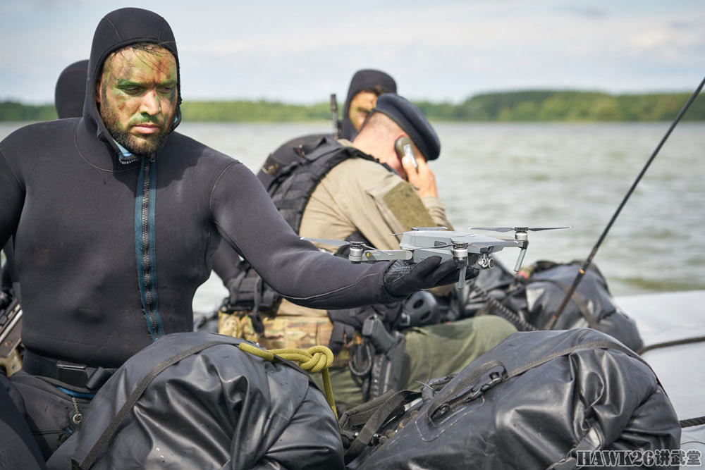 后续登陆的葡萄牙蛙人部队,一名蛙人正准备释放中国大疆研制的“御”折叠无人机。这种无人机折叠后尺寸非常紧凑,非常便于携行。