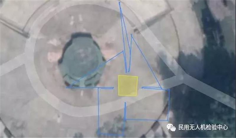 图片中黄色区域,是为了检验而划定的无人机围栏,蓝色线条是“亿航”无人机在在实际测试中的飞行轨迹。可以看到在靠近围栏时,无人机可以有效进行悬停或返航。避免无人机进入围栏区域。