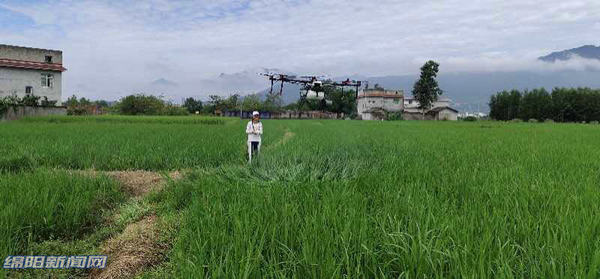 “左转、直飞、停留、右转、降落……”7月30日上午,雨后的江油武都镇涪阳村阳光灿烂,一望无际的稻田泛着绿浪,明利家庭农场的女主人郑明利正手持摇杆,控制着无人机进行植保作业,给出穗扬花的稻子喷洒农药。