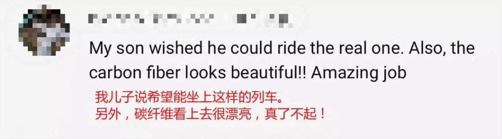 " 我儿子说希望能坐上这样的列车。另外,碳纤维看上去很漂亮,真了不起!"