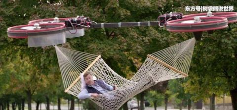 众所周知,随着科技的发展,无人机的用途越来越广,然而,在国外有一个叫做 Pim Bucker 的小哥,他通过多次试验,自己做了一台体积巨大、外形酷炫的无人机。并且这个无人机就只有一个功能。前前后后他设计了多张草稿,最终成功研制出来。那么 这台无人机唯一的功能是什么呢?没错,正如大家所看到的这样,这台挂着吊床的无人机唯一的功能,就是让 Pim Bucker 可以躺在上面,跟着无人机飞来飞去。听起来十分的科幻。