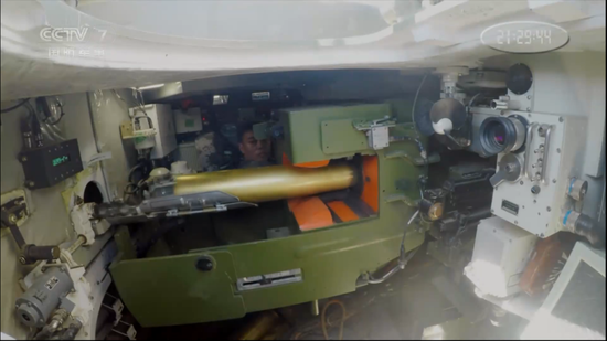 在节目中,观众首次看到炮塔内部和装弹机的工作情况。相比125mm坦克炮的转盘式自动供弹,尾舱式弹药存放在炮塔后部,隔舱化存储增强了坦克生存能力,而且坦克内部没有提弹机,炮塔内部空间不会像125mm炮塔这么拥挤。
