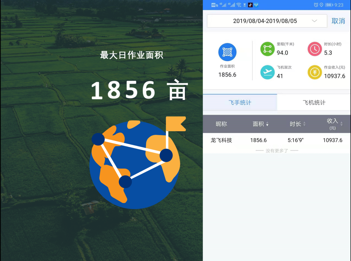 优秀的产品也在4月份推向市场以来为植保队创造了出色的成绩:最长作业距离达到单次3111米,一小时作业量曾达到惊人的399.9亩,无距植保联盟所属的植保队在黑龙江完成单日作业1856.6亩的好成绩。