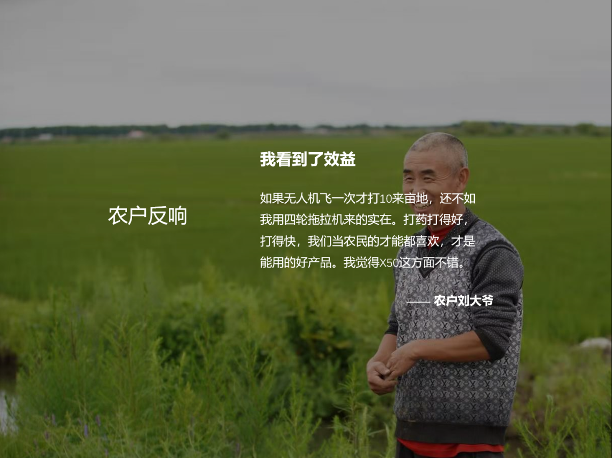 首先,梅总从当前农业无人机的市场需求出发,介绍了X50的研发初衷。2019年中央一号文件提出坚持农业农村优先发展的总方针,而如今,农业生产过程也逐步走向专业化和精细化,在这样的环境和趋势下,农业机械使用逐渐专业化,农业亟需科技力量的支持。从农业主题角度,农户关注效果,植保作业队伍关注作业效率,这些都要求着农机产品的稳定高效。因此,一款下压风场强、药箱载荷大、作业效率高的单旋翼植保无人机应运而生。这也是X50的设计初衷!