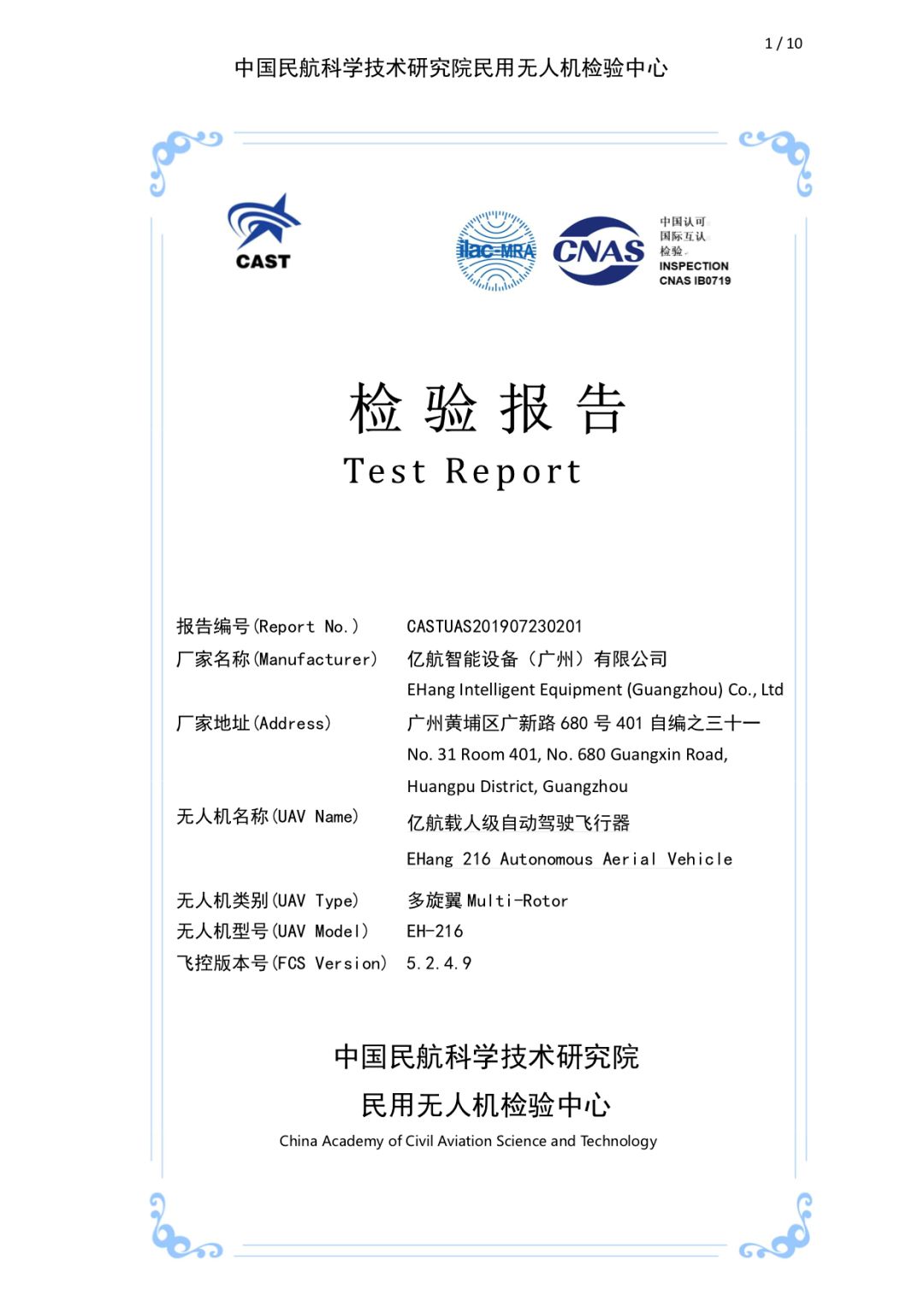 作为中国合格评定国家认可委员会(CNAS)权威授权的行业内首个从事无人机检验的A类第三方检验机构,航科院民用无人机检验中心基于RTK高精度定位的无人机围栏检验系统,针对亿航载人级自动驾驶飞行器(AAV)、亿航天鹰行业应用无人机分别进行了4大项28小项的检验项飞行测试,包括无人机与无人机围栏接近时自动悬停及返航、围栏内无人机不能启动、围栏内无人机启动后告警等。检验结果全部合格,亿航AAV以及亿航天鹰均达到了无人机系统安全能力II级。