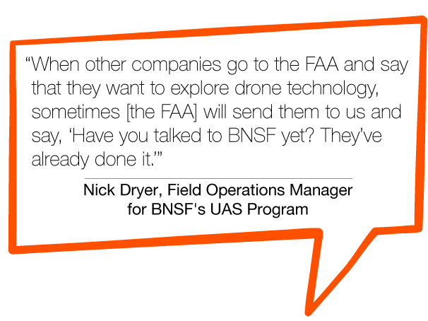 这些先进的无人机操作使BNSF成为领导者,不仅在其他货运铁路公司中,而且在商业公司中。德瑞提到:“当其他公司到联邦航空局说他们想探索无人机技术时,有时(联邦航空局)会把他们送到我们这里,说,‘你和BNSF谈过了吗?’他们已经做到了”。
