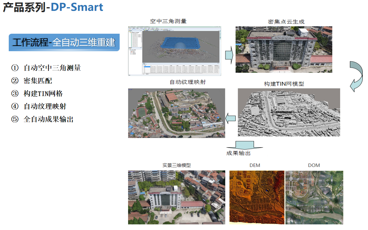 天际航全自动建模软件DP-Smart是自主研发的一套从多视影像,全自动生成高分辨率真三维模型的自动化处理软件。软件基于摄影测量、计算机视觉与计算几何算法,支持全自动空三计算、密集点云生成、构建网格、自动纹理映射等步骤,实现真三维模型的快速生成。旨在解决传统数字城市建设采用人工建模导致的效率低下、人力成本高、模型质量差等问题。