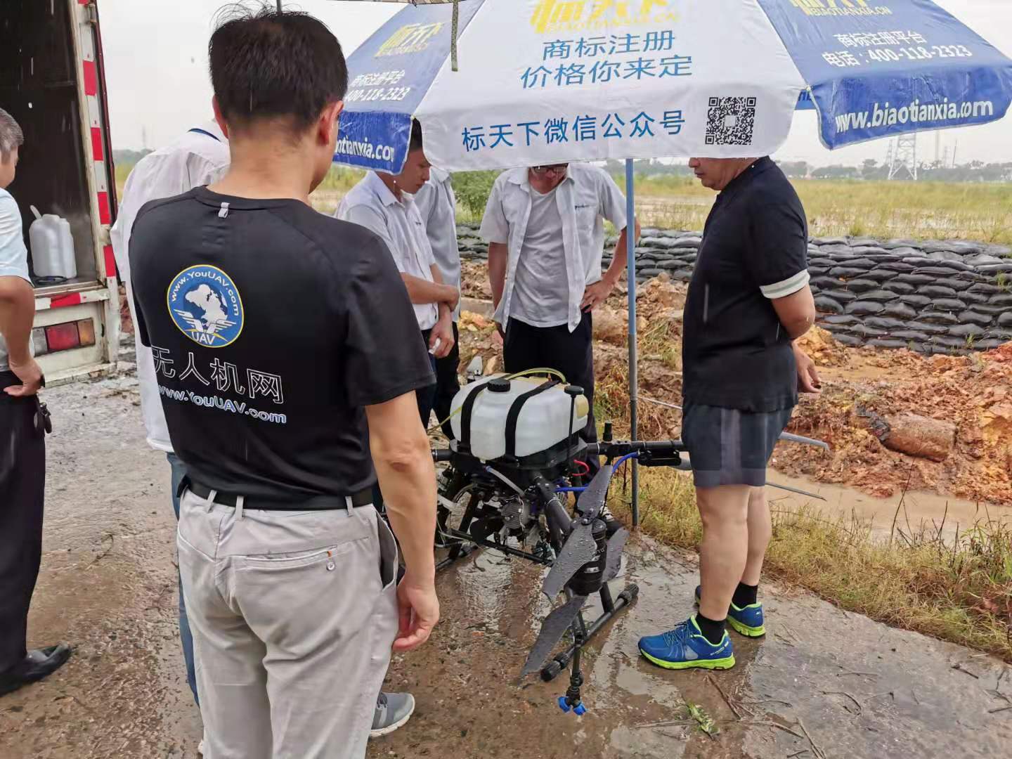演示当天下起中雨,不过对于华科尔油电混合植保机来说不是问题,因为整机各个关键部位都已进行了防水保护,就是为了后期方便用户在作业后用水清理污渍。