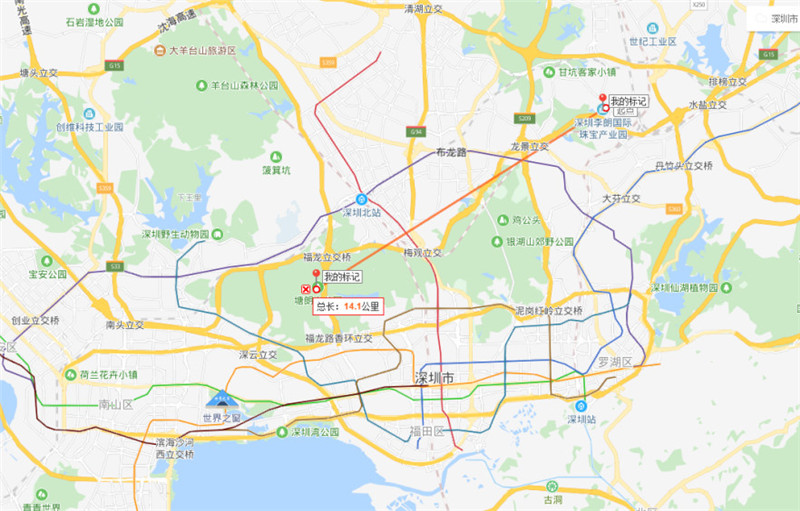 4)单跳通信距离:市面上同类自组网产品的单跳距离一般在10公里左右,在此次检测检验中,慧明捷的自组网产品分别架设于深圳市龙岗区李朗珠宝园和深圳市宝安区塘朗山,直线距离达到14.1km;