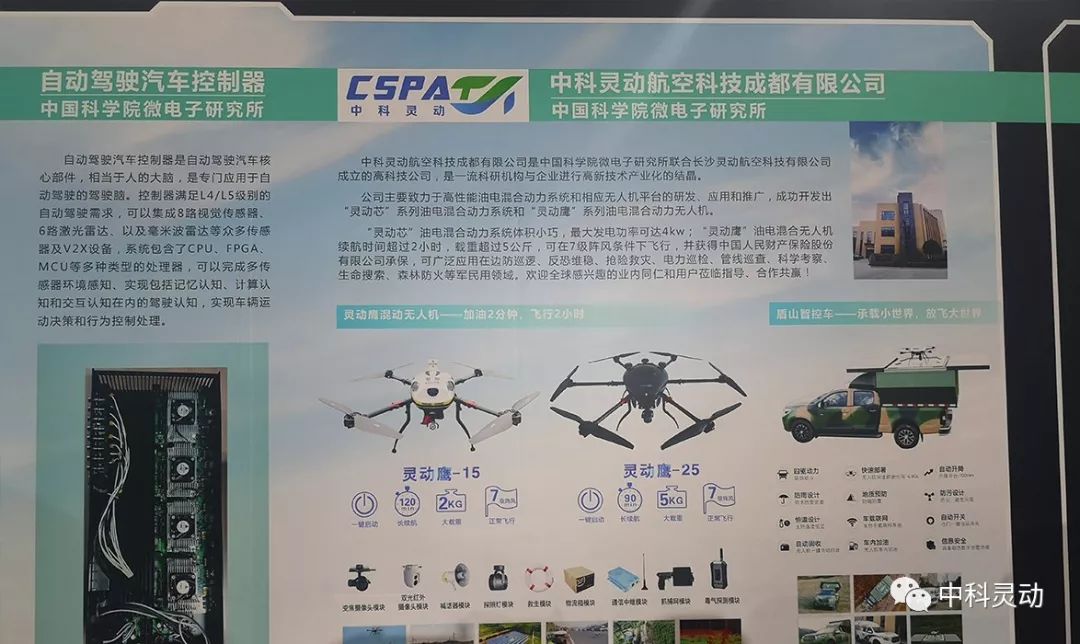 中科灵动航空科技成都有限公司在中科院统一组织下,参加了本次展会,中科灵动参展的主要展品是“盾山智控车”、“灵动鹰-15”无人机和“灵动鹰-25”无人机。中科灵动主要致力于高性能油电混合动力系统、相应无人机平台和配套无人机智控起降运输车的研发、应用和推广。中科灵动研发的“盾山智控车”、“灵动鹰-15”无人机和“灵动鹰-25”无人机在相关机构和部门均获得一致好评,深受行业喜爱。