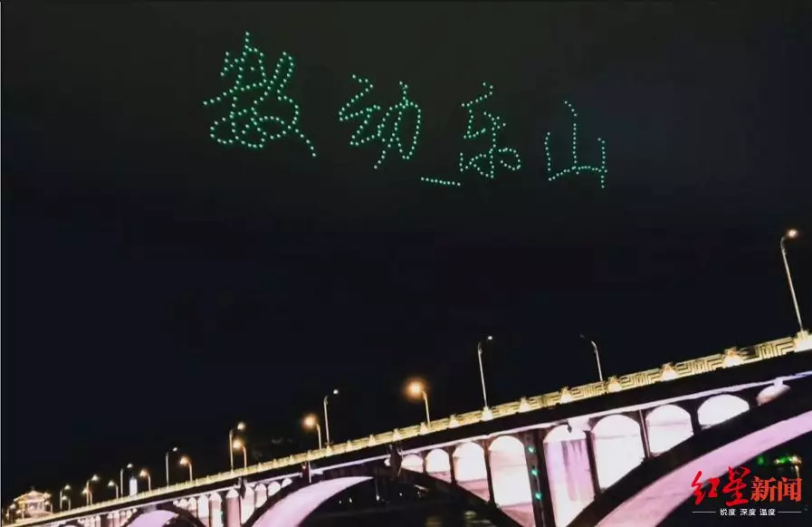 当晚,没有月亮升空,但众多游客和乐山市民在乐山岷江一桥附近观看了这场无人机表演秀。该活动由乐山市数字经济发展局等单位主办,并通过网络平台进行了直播,只见各种绚丽的图案普通电子烟花绽放在夜空,让人流连忘返。
